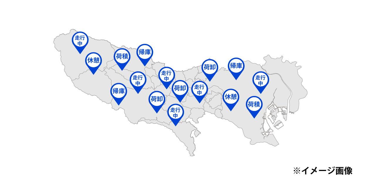 当社では、GPSを利用した動態管理システムを導入しており、リアルタイムに全車両の運行状況を管理し、輸配送スケジュールの見直しや安全運転への取り組みに活かしています。